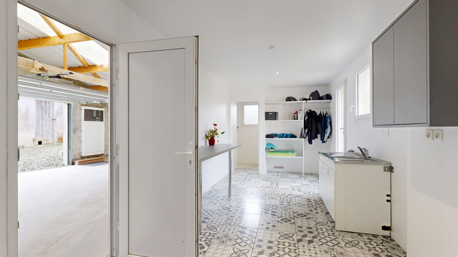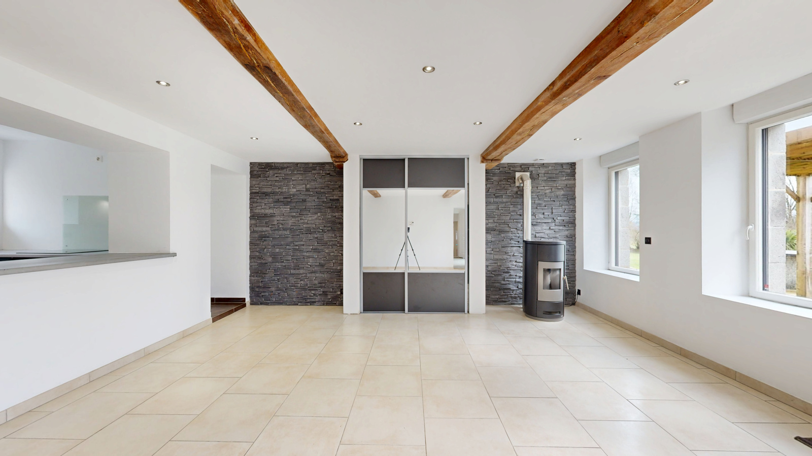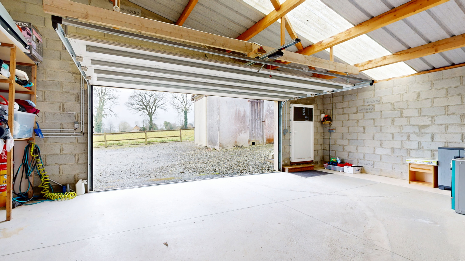 Séjour lumineux avec poêle à granulés ouvert sur cuisine A/E, salon, salle d'eau, autre pièce à vivre avec accès sur l'extérieur, wc, double garage avec porte motorisée donnant sur arrière cuisine/ buanderie pour le côté pratique.