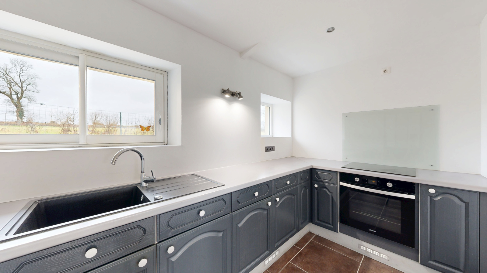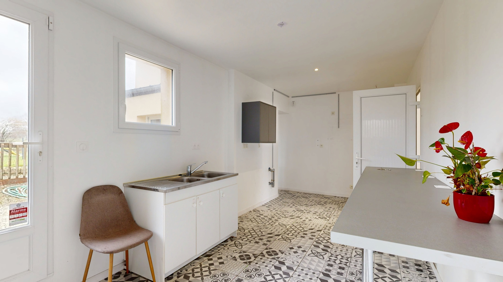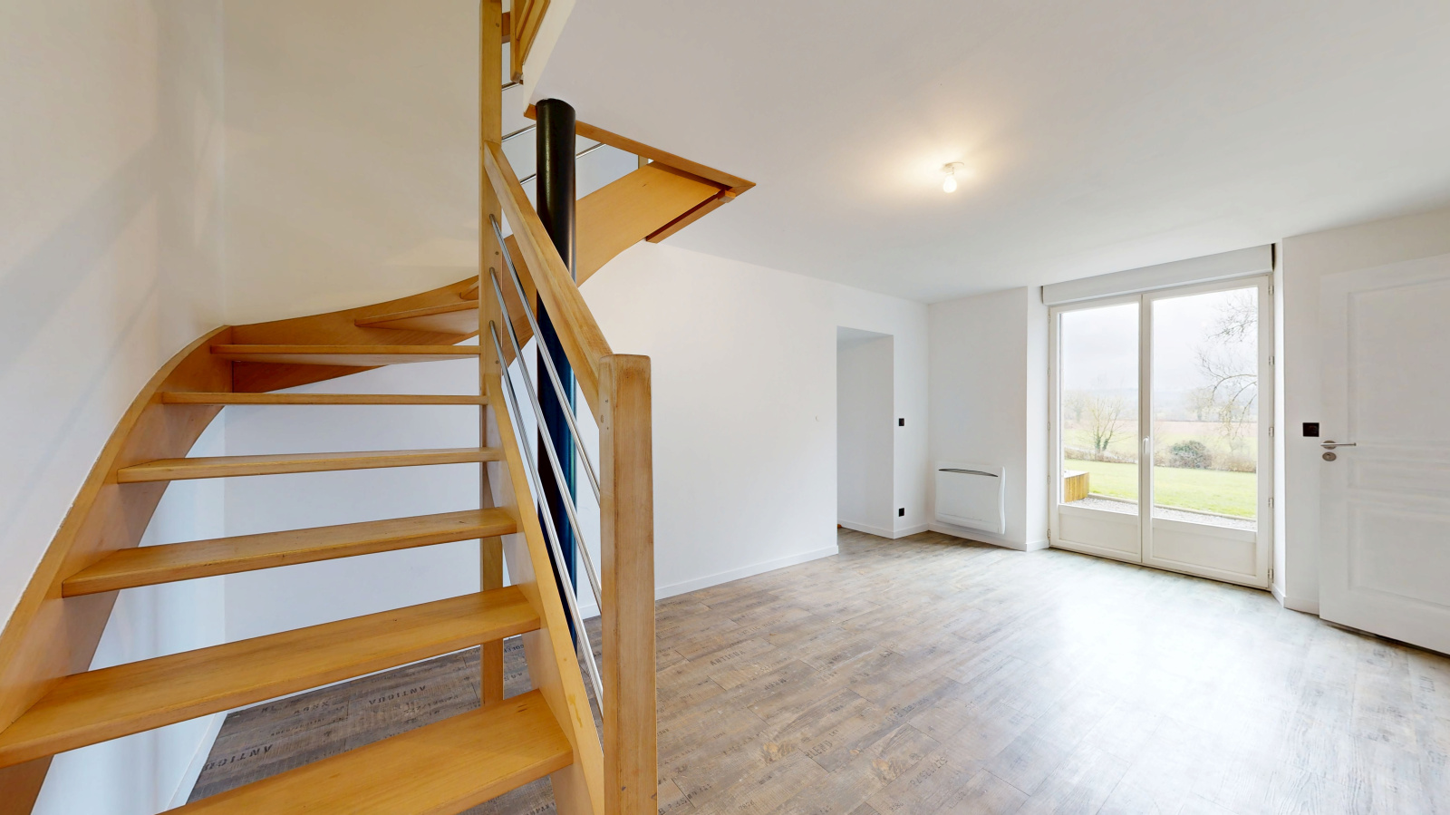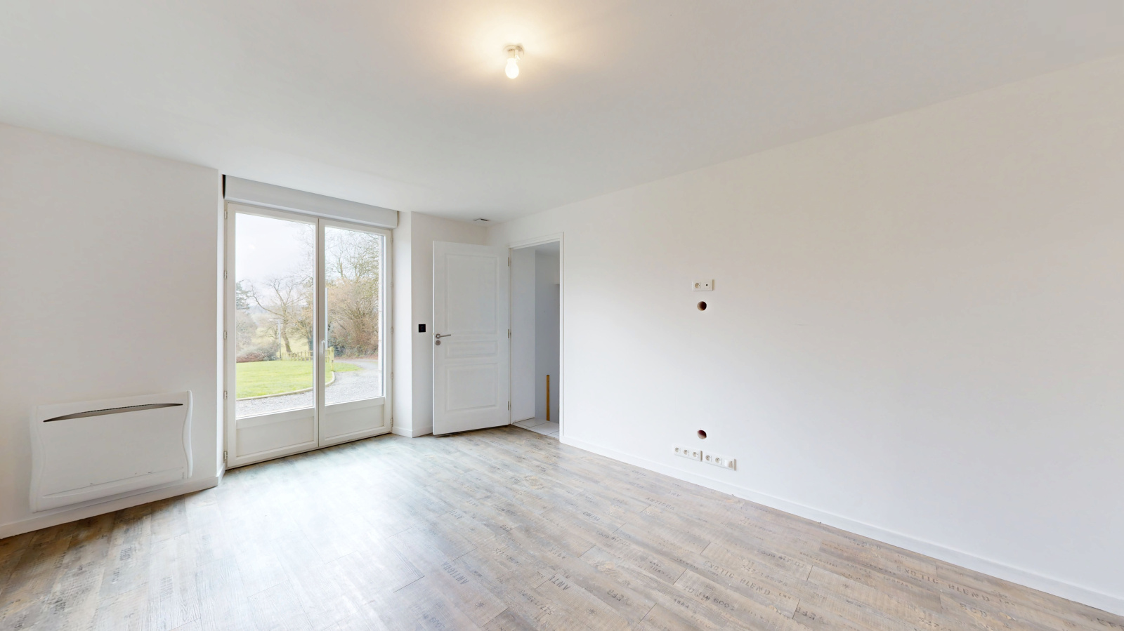 Séjour lumineux avec poêle à granulés ouvert sur cuisine A/E, salon, salle d'eau, autre pièce à vivre avec accès sur l'extérieur, wc, double garage avec porte motorisée donnant sur arrière cuisine/ buanderie pour le côté pratique.