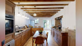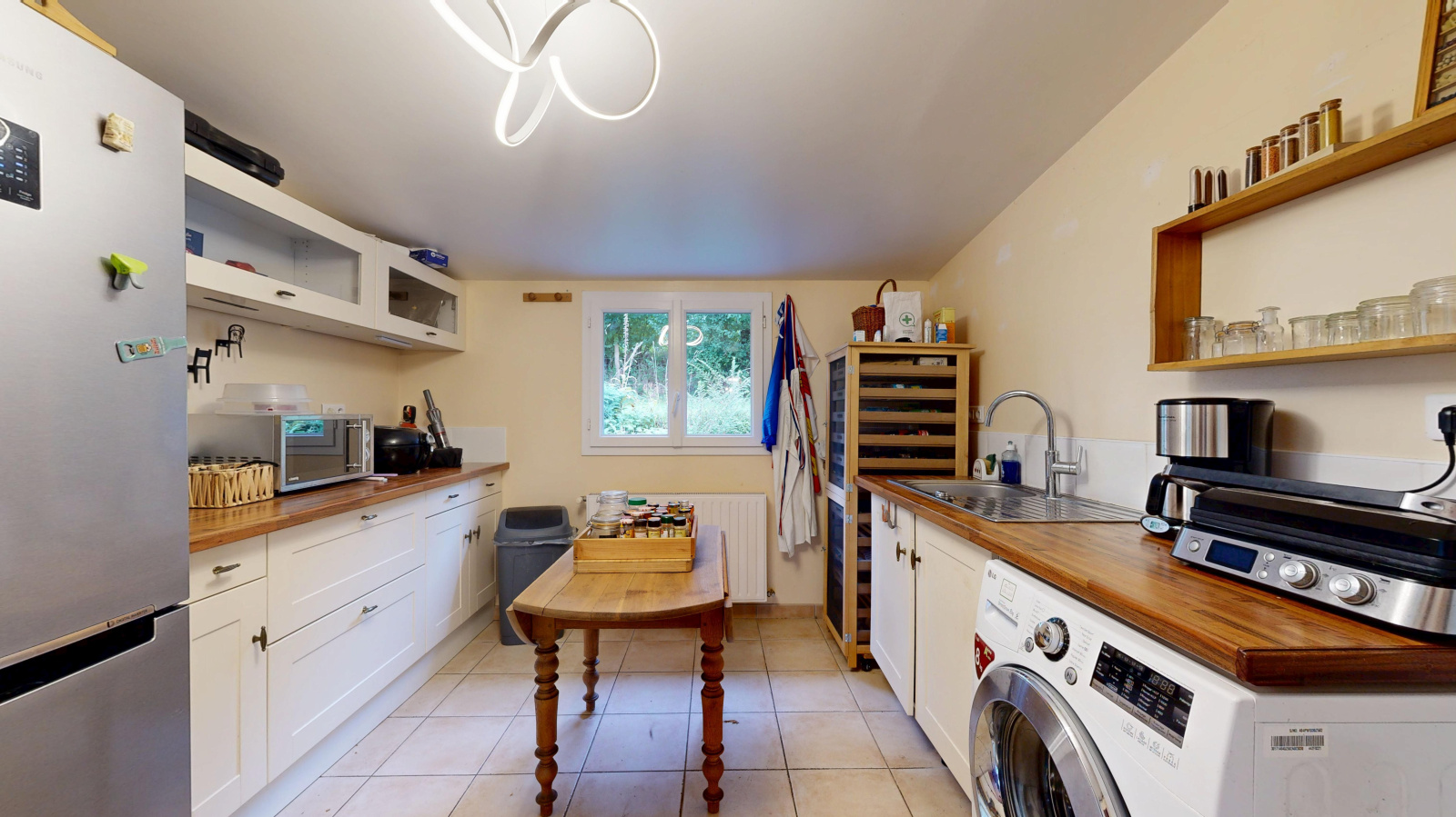 •Au rez-de-chaussée : d'une entrée, une grande salle à manger avec insert, un chaleureux salon avec poêle à bois et une cuisine neuve aménagée et équipée donnant sur la terrasse exposée Sud-Est, une arrière-cuisine, une buanderie/ chaufferie, un WC indépendant et un garage attenant.