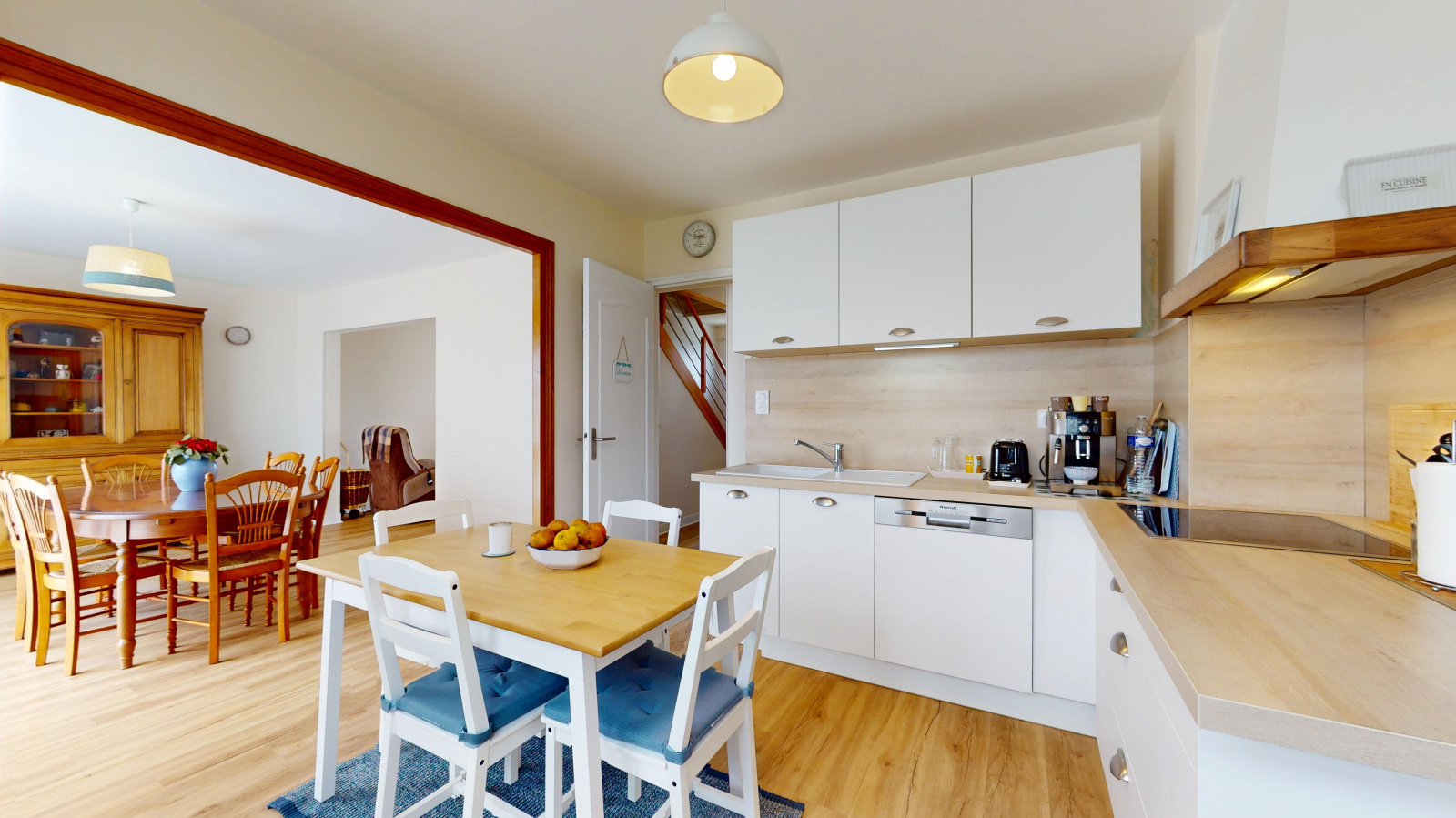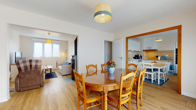 Au rez-de-chaussée surélevé : une entrée, un espace ouvert de 40m2 comprenant un salon avec poêle à bois / une salle à manger / une cuisine aménagée et équipée, trois chambres de 9, 12 et 14m2 dont une avec rangements, une salle d’eau avec douche à l’italienne, ainsi qu’un WC indépendant.