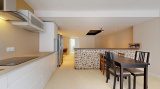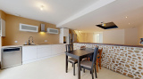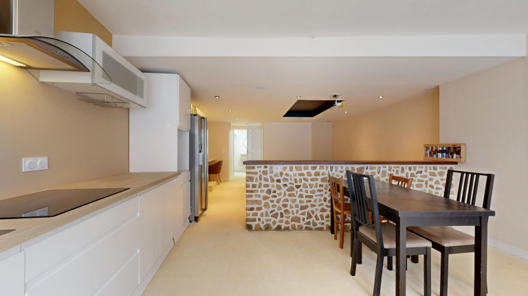 Le rez-de-chaussée s’ouvre sur une pièce de vie de 40 m², où la cuisine équipée se prolonge naturellement vers le séjour. L’ensemble forme un espace ouvert et fonctionnel. En arrière-plan, un espace pouvant servir de bureau ou lingerie-chaufferie ainsi qu’une salle d’eau avec WC complètent ce niveau.