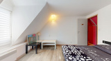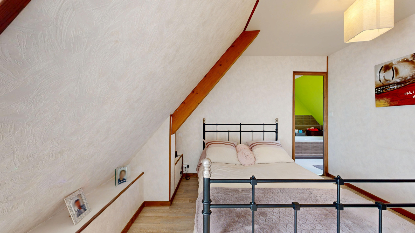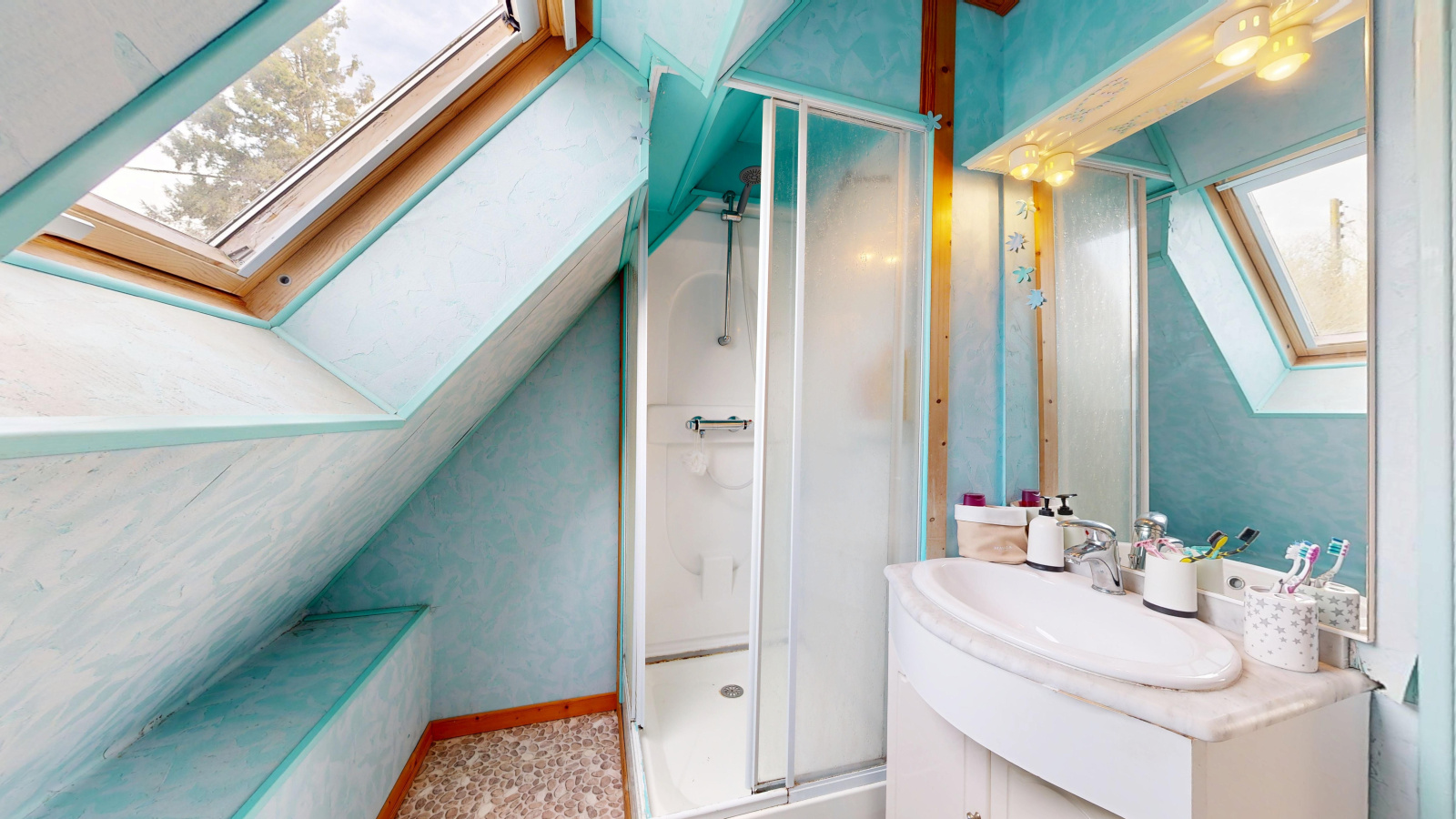 À l’étage, deux chambres, chacune avec sa salle d’eau ou salle de bains privative et son espace dressing ou placard.