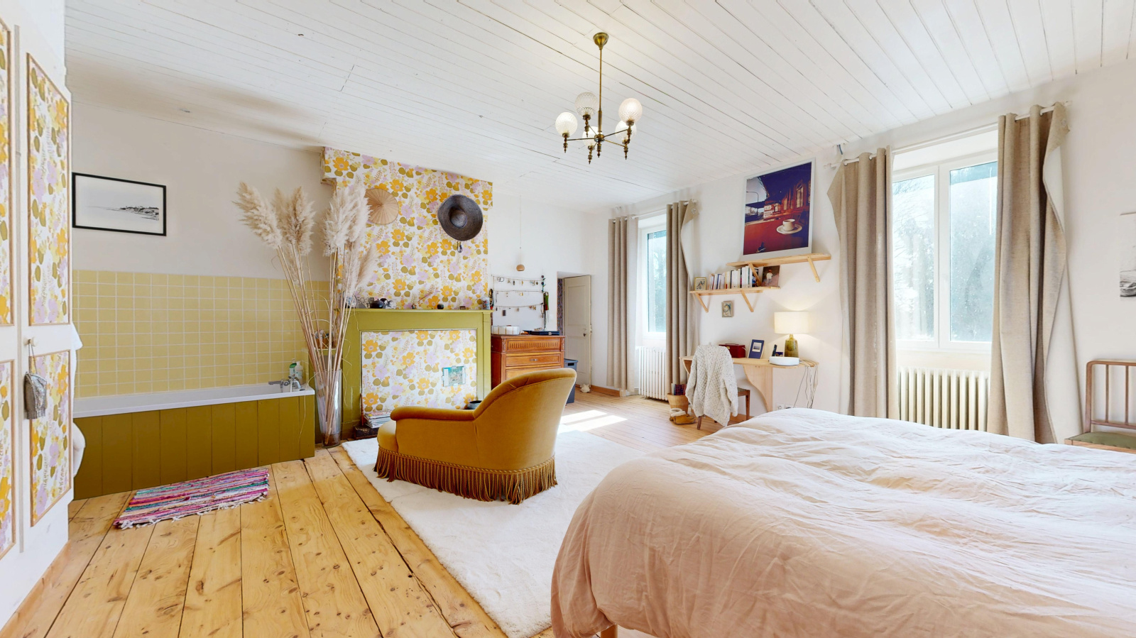 À l’étage : un palier desservant trois chambres, dont une suite avec baignoire, un WC avec point d’eau, et une salle d'eau