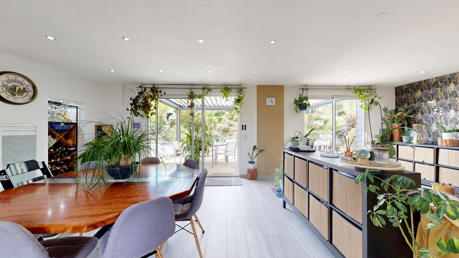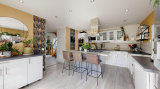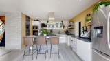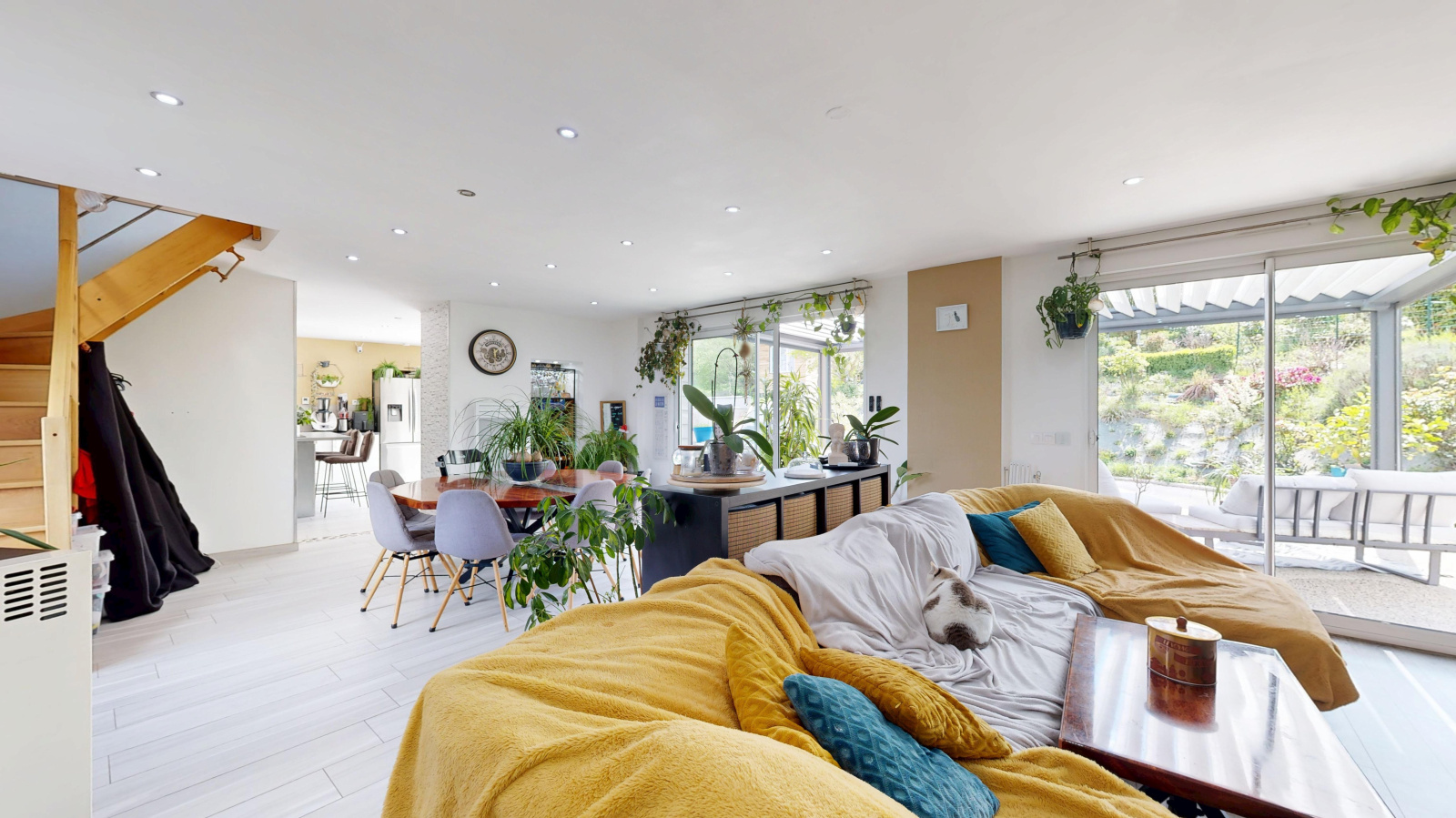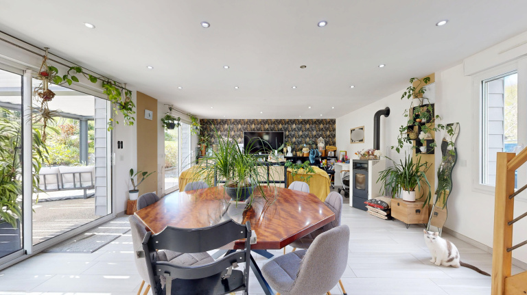 La pièce de vie s’organise autour d’une cuisine aménagée et équipée de 20 m², prolongée par un séjour de 43 m² baigné de lumière.