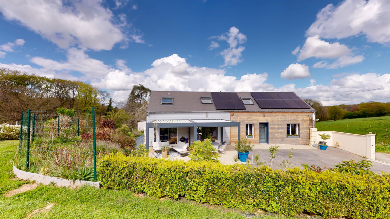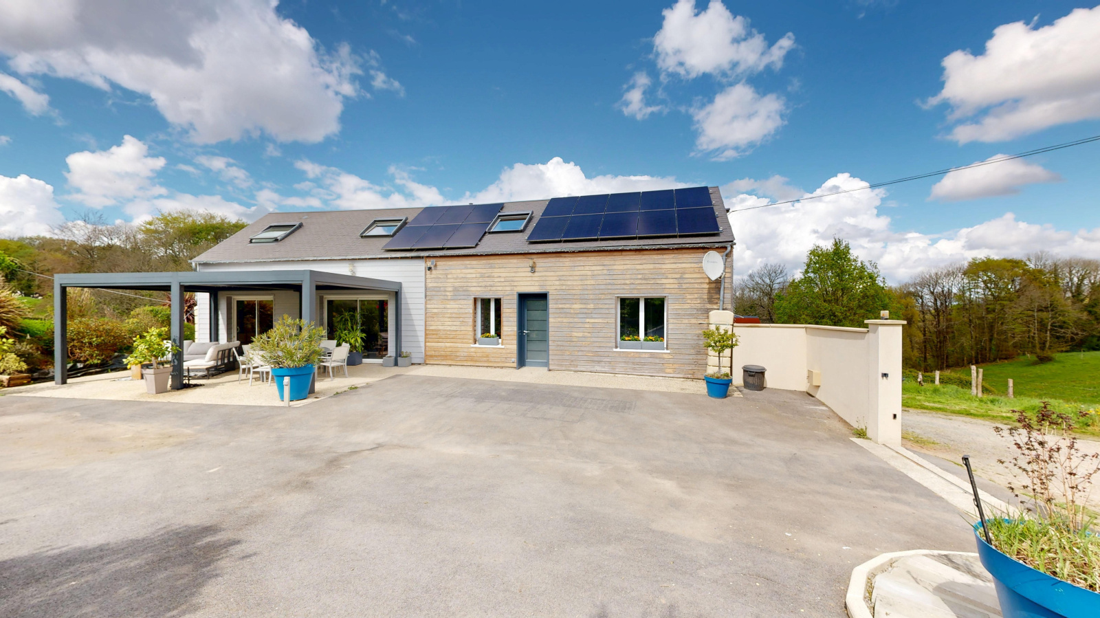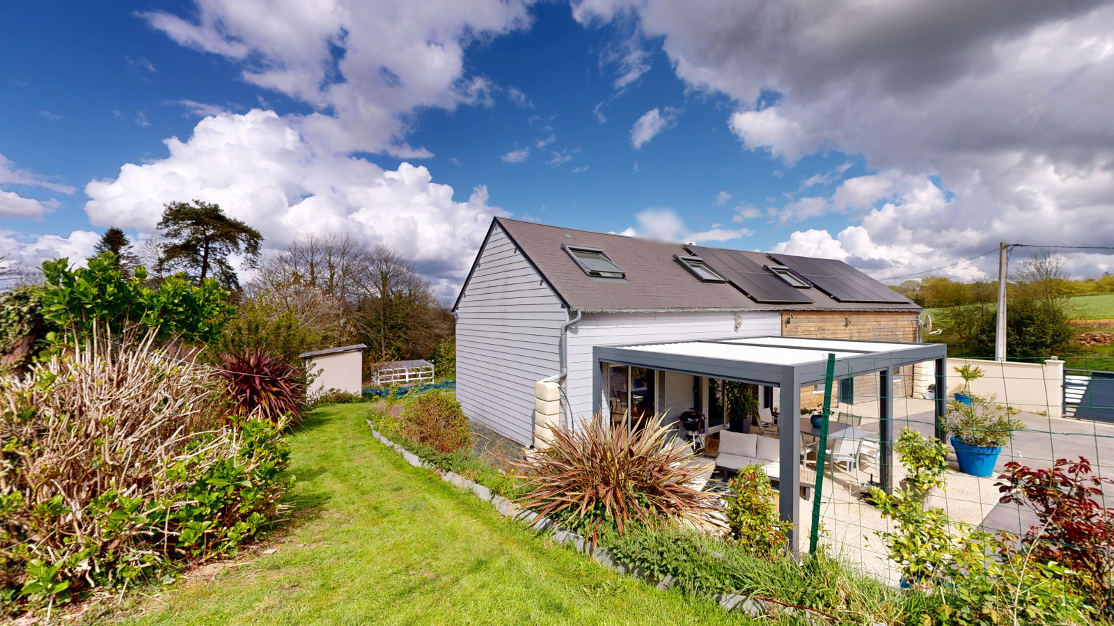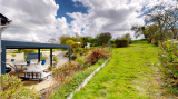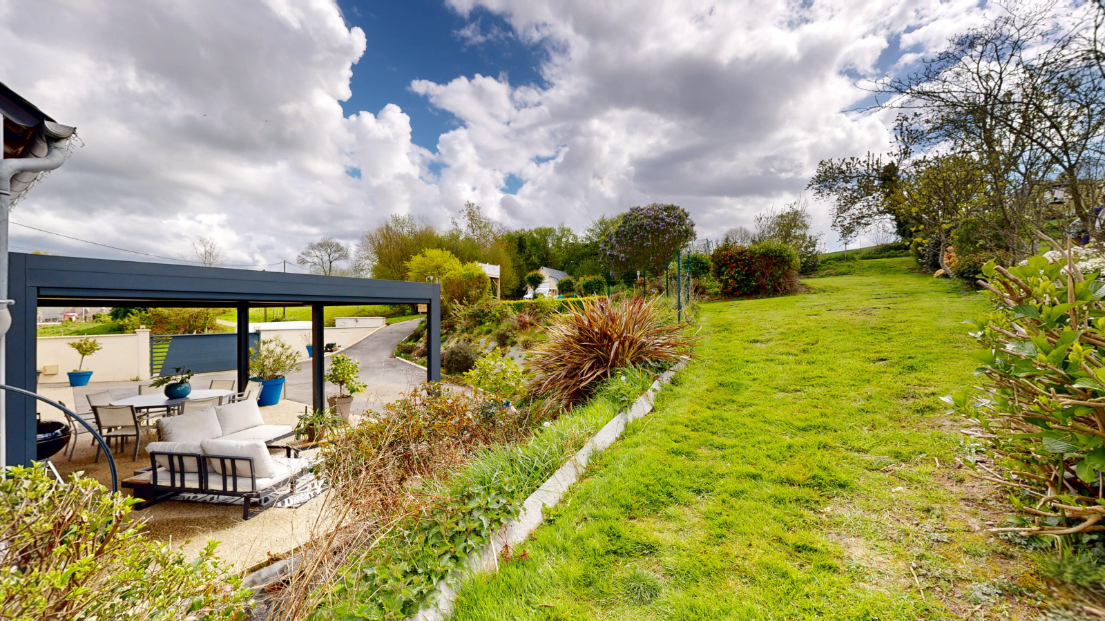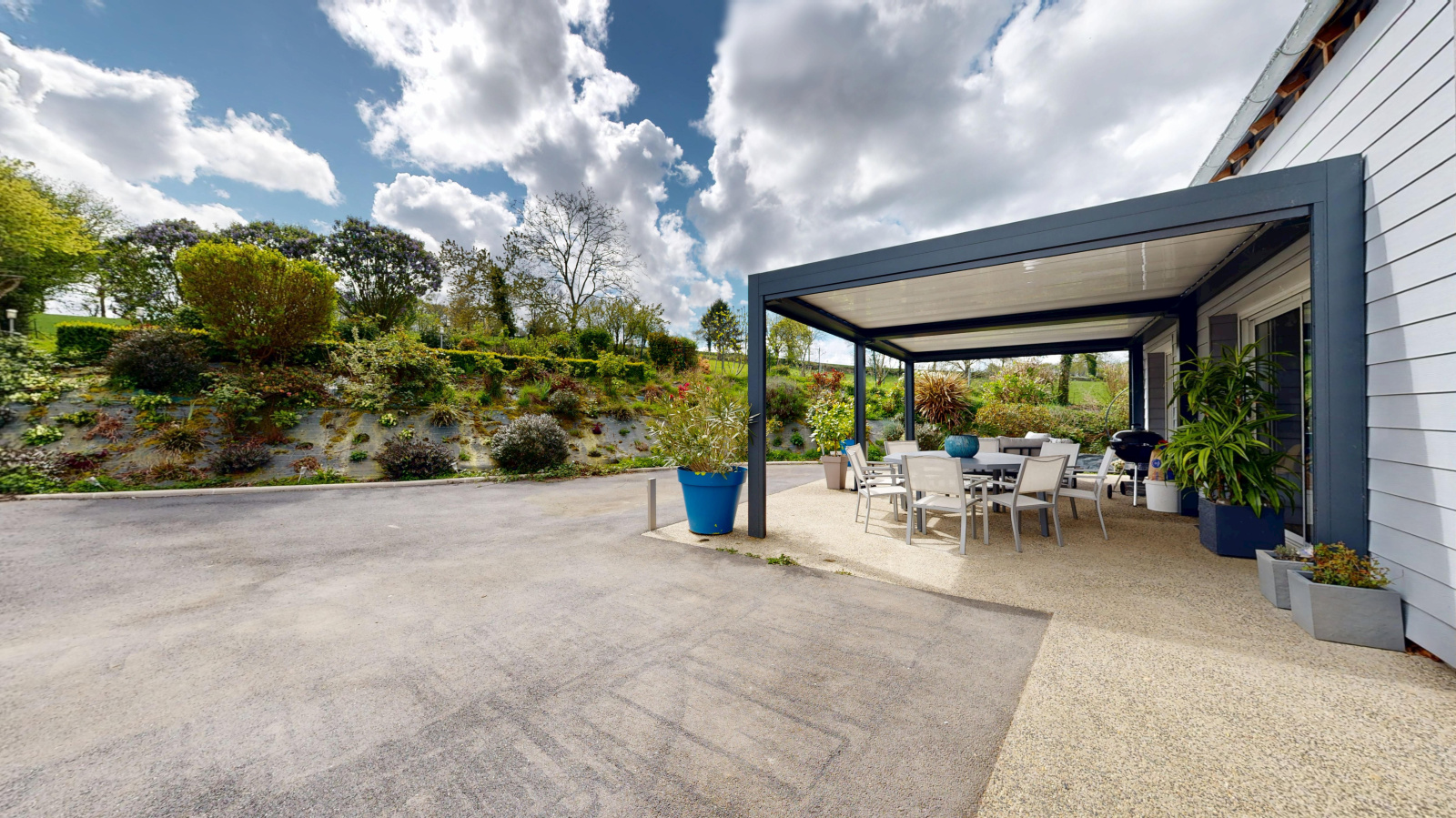 Dans le prolongement de la maison, une terrasse en béton gravillonné accueille une pergola bioclimatique motorisée de 7 x 4 mètres, équipée de stores intégrés, offrant un espace de vie supplémentaire au fil des saisons.