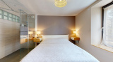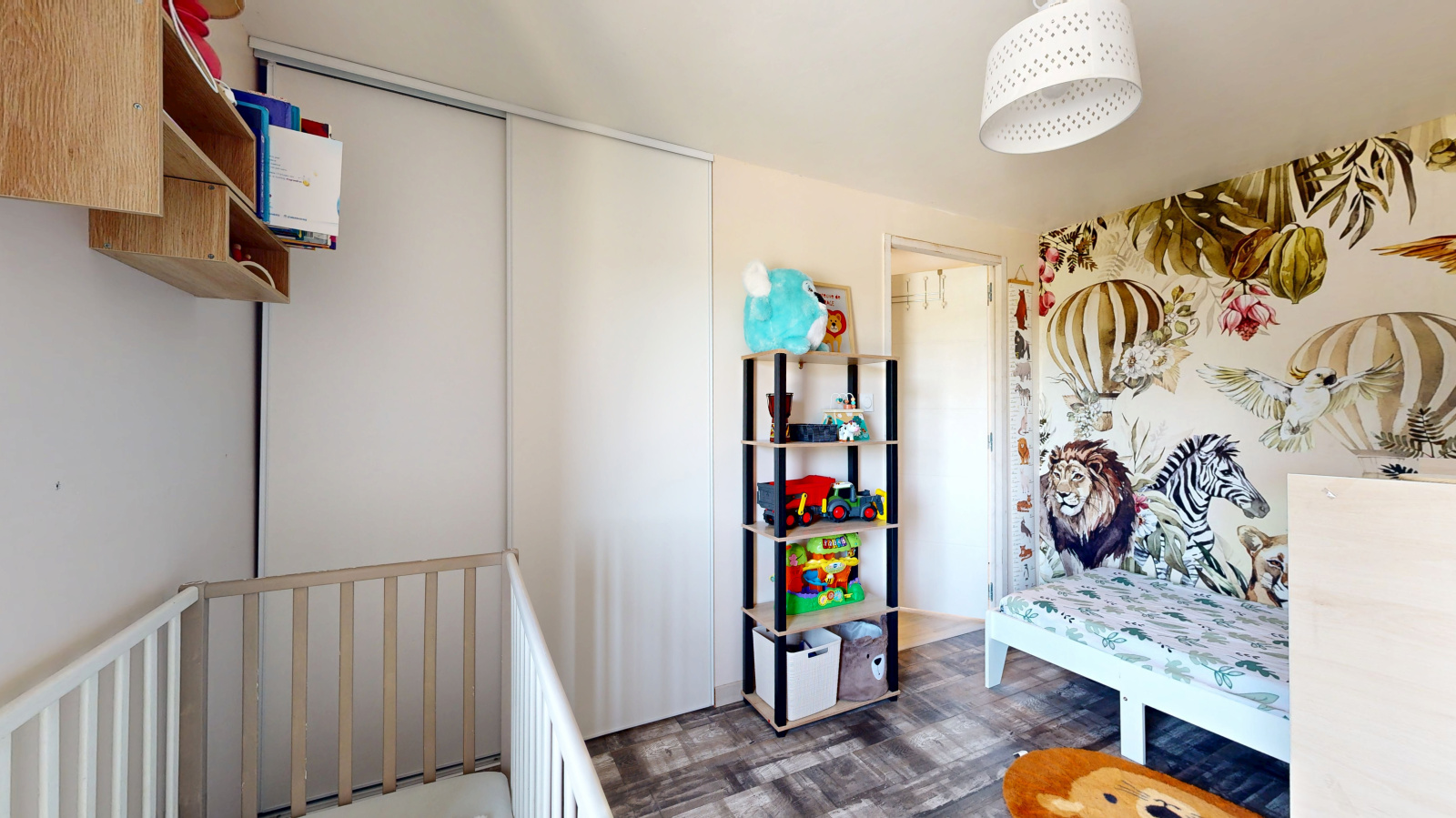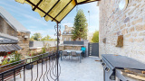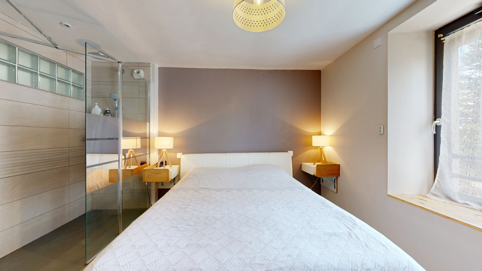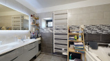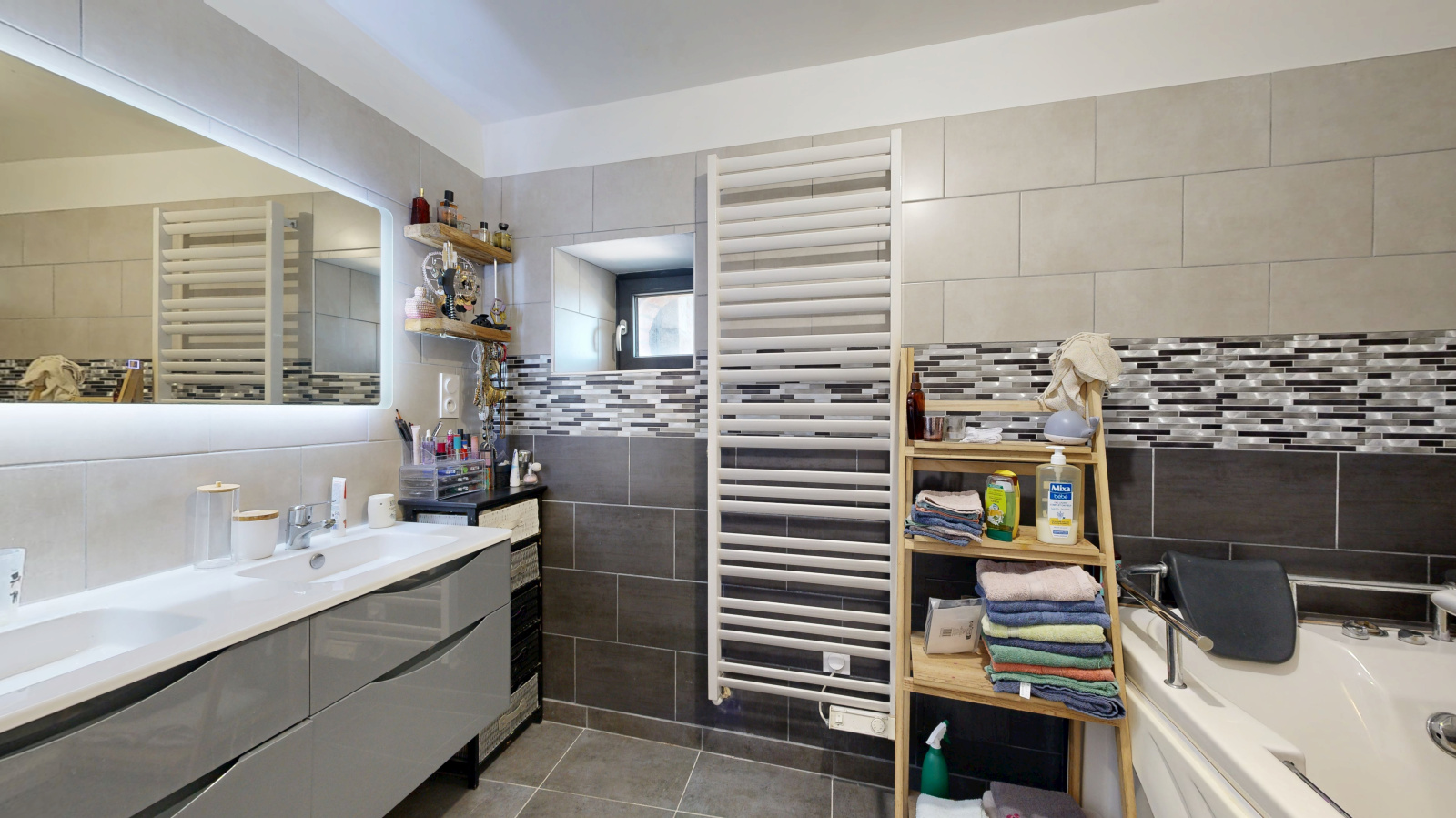 L’étage accueille trois chambres avec rangements, dont une avec douche privative, ainsi qu’une salle de bain équipée d’une double vasque et d’une baignoire balnéo. Un second WC indépendant complète ce niveau.