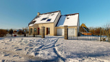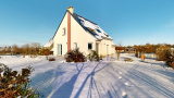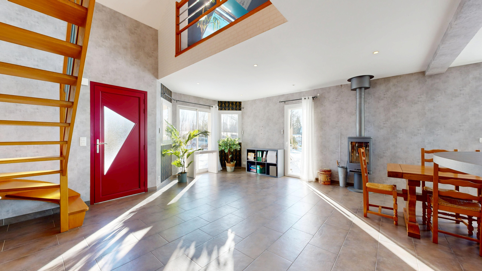 Les prestations sont actuelles : menuiseries aluminium double vitrage, volets roulants électriques, plancher chauffant au rez-de-chaussée alimenté par une pompe à chaleur, complétés par un poêle à bois dans le salon.